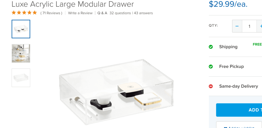 Before going shopping, I gathered all of my ideas and made some sense of what my ideal makeup organizing unit would look like; the best way to organize your makeup! I wanted the unit to be acrylic with drawers, look nice (since it was going to be on display in our bathroom), and deep enough to fit all of my makeup. While I was looking for a new makeup organizer, I was honestly getting a little frustrated. Every where I looked, organizers would either be too big, too small, not acrylic, or just plain ugly! Until, I stumbled upon a store that was a total game changer for me. What store was that? The holy grail of organizing, of course. It was the Container Store!