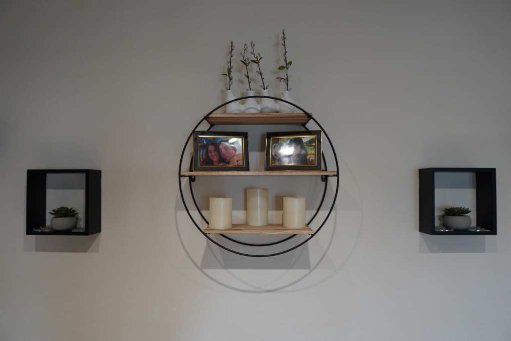 Putting all of the Amazon Home Decor floating shelves together, the once all – white (now off – white after living here for some time) bland wall, became a statement piece of the house!
